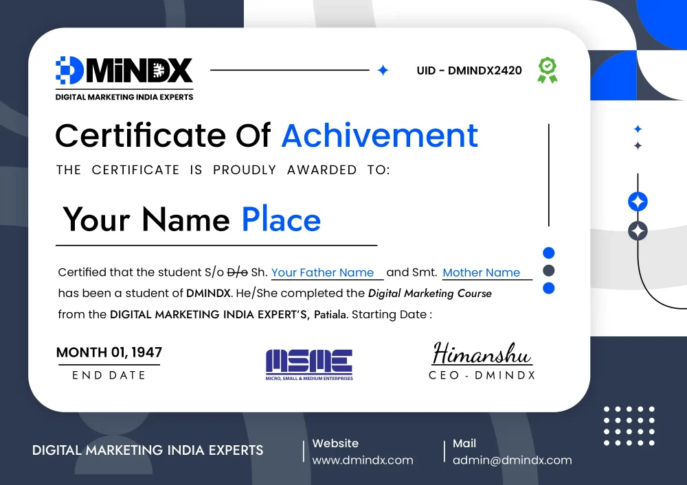 At DMindX (Digital Marketing India Experts), we are proud to be the first and fastest-growing performance marketing institute in Patiala, offering Best Digital Marketing course to you from basic to advanced levels.